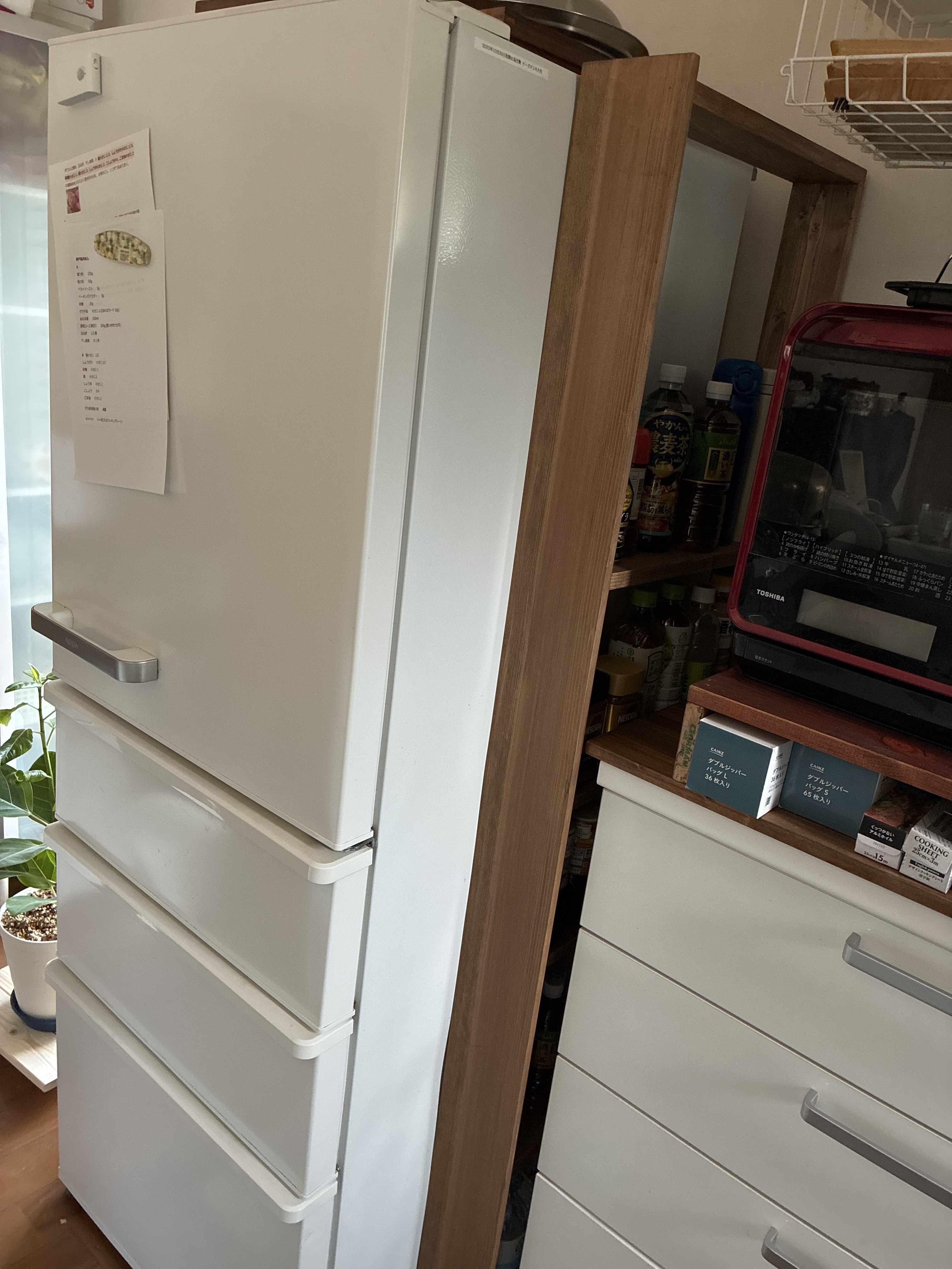 ③スッキリ見え(冷蔵庫に高さを合わせて、前面に杉板をワンバイフォー側から打ちつけたらスッキリとした印象になりました。)
