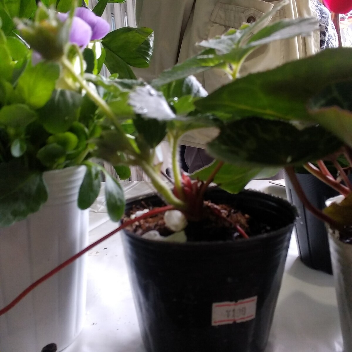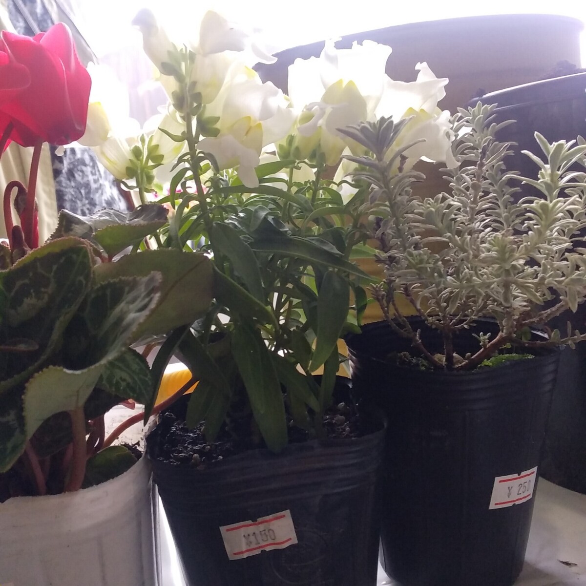 左からシクラメン、金魚草、ウエストリンギア