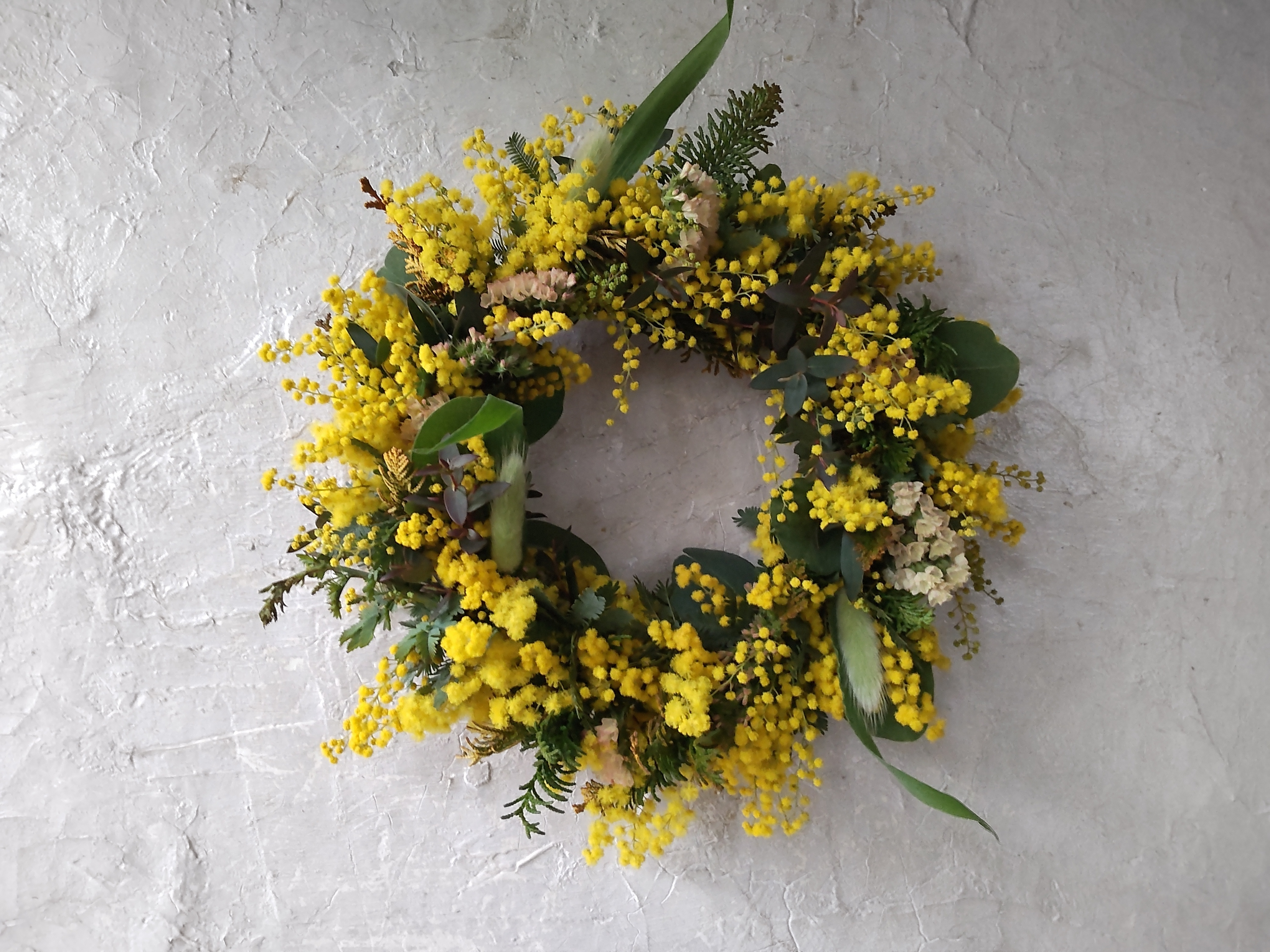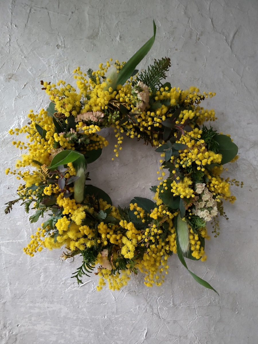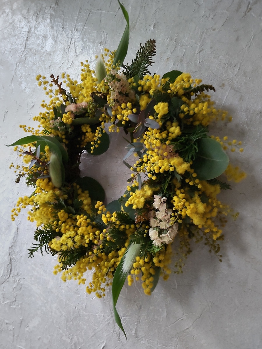 先月ですけど、お気に入りのお花屋さんで ミモザのリースを作ってまいりましたよ(๑•̀ㅂ•́)و✧