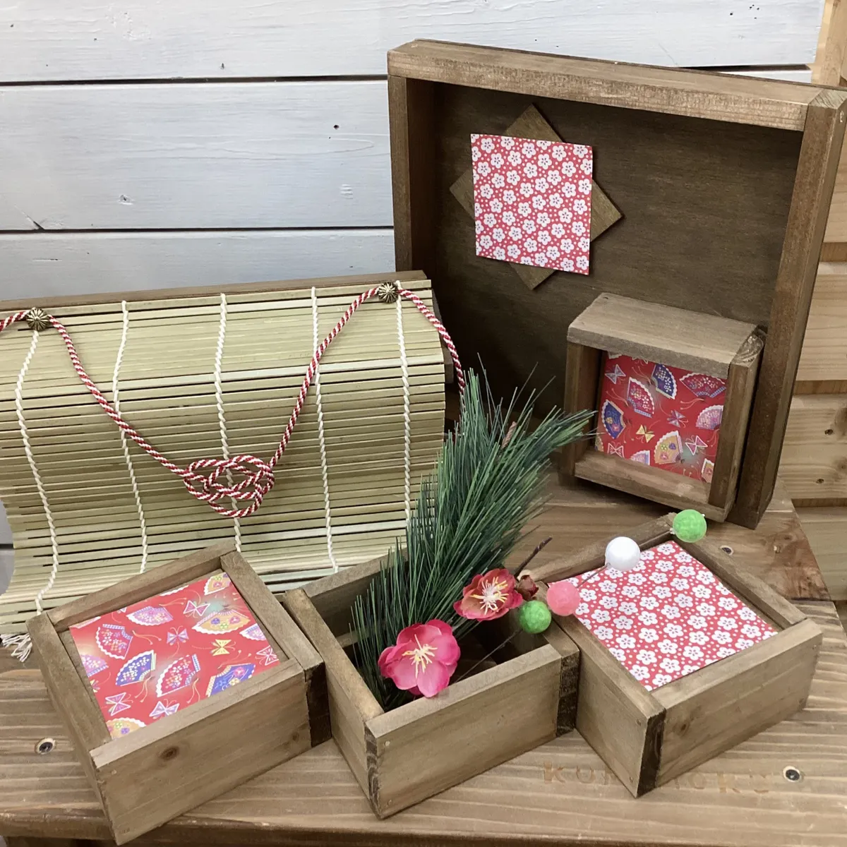 木の枡を組み合わせた小さな御膳に和柄の折り紙をあしらって、お正月のしつらえをDIY。