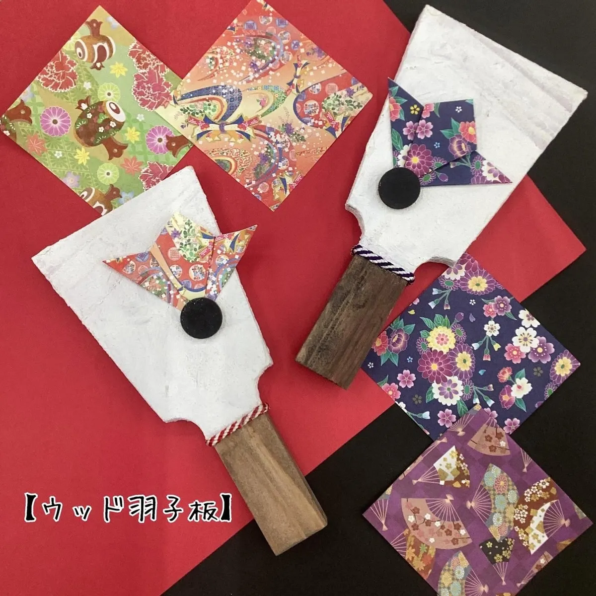 木と和柄の折り紙を使って羽子板飾りを作ります。
