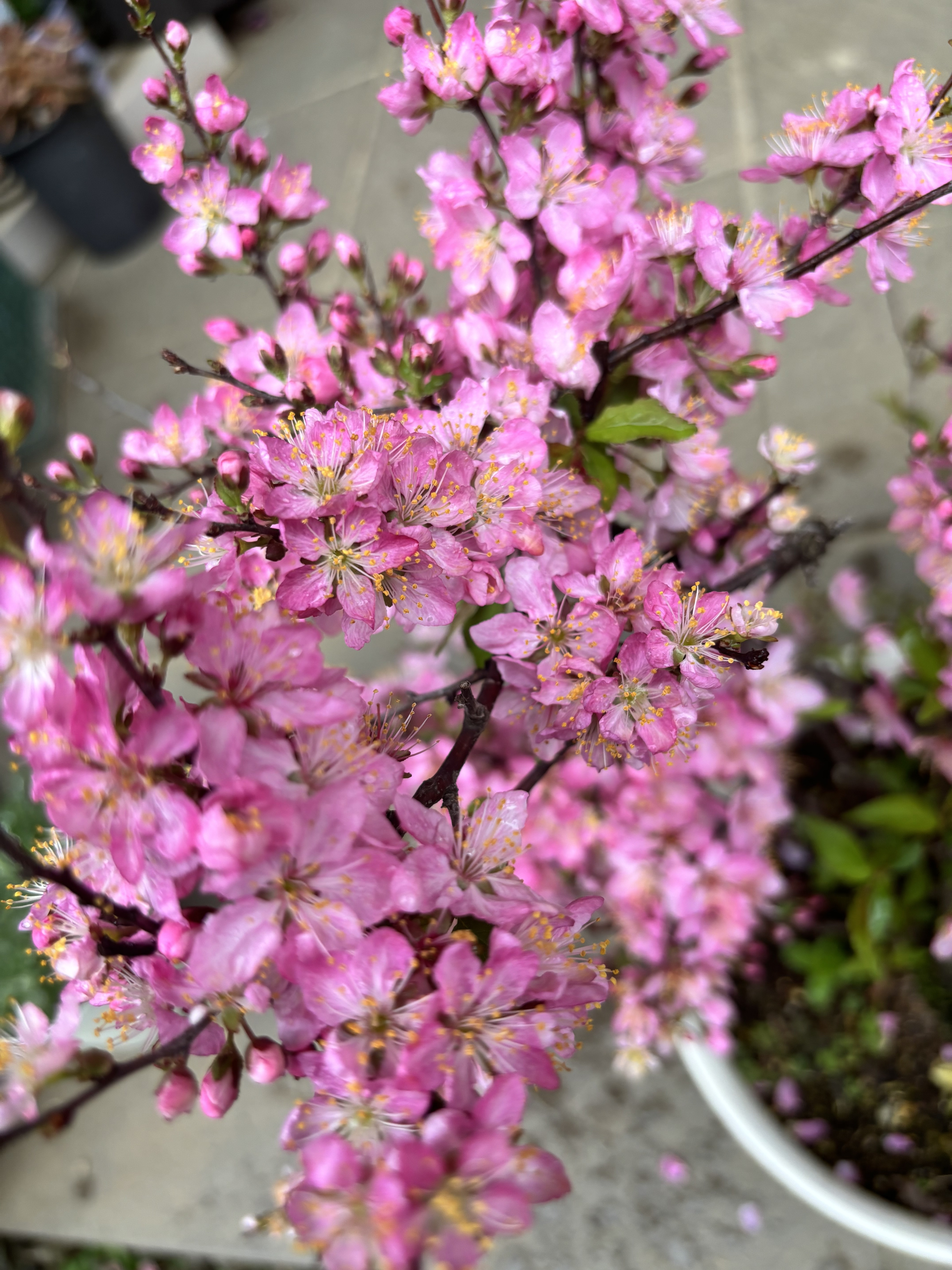 私 3年前に鉢植え始めました。私のユスラウメの花は白です(あなたのピンクの様にこんなに密で満開にはなりません😅)現在、少し白い花を咲かせいますが、(3年間)未だ実を食べていません。