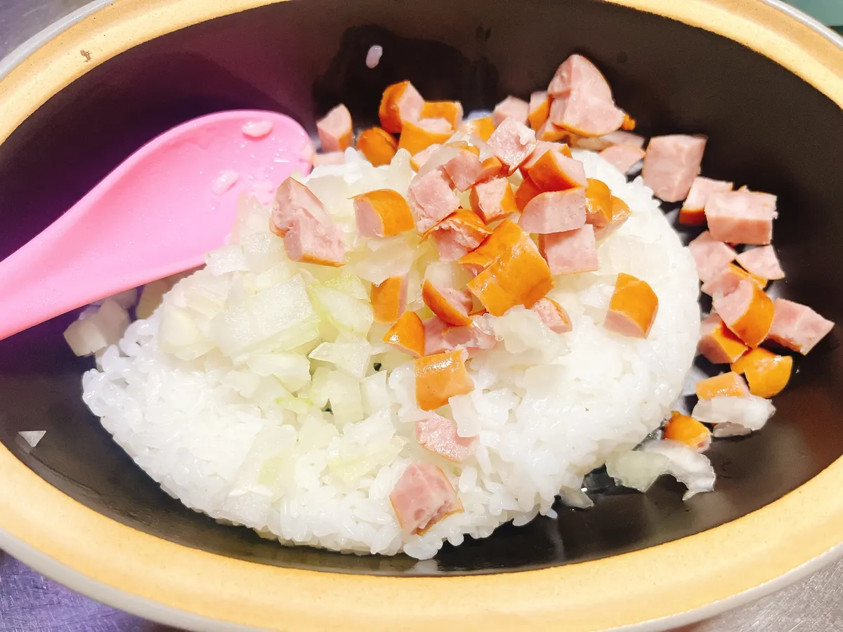 パスタポットに、ご飯・シャウエッセン・玉ねぎ・ケチャップ・コンソメ・塩胡椒を入れよく混ぜる。
