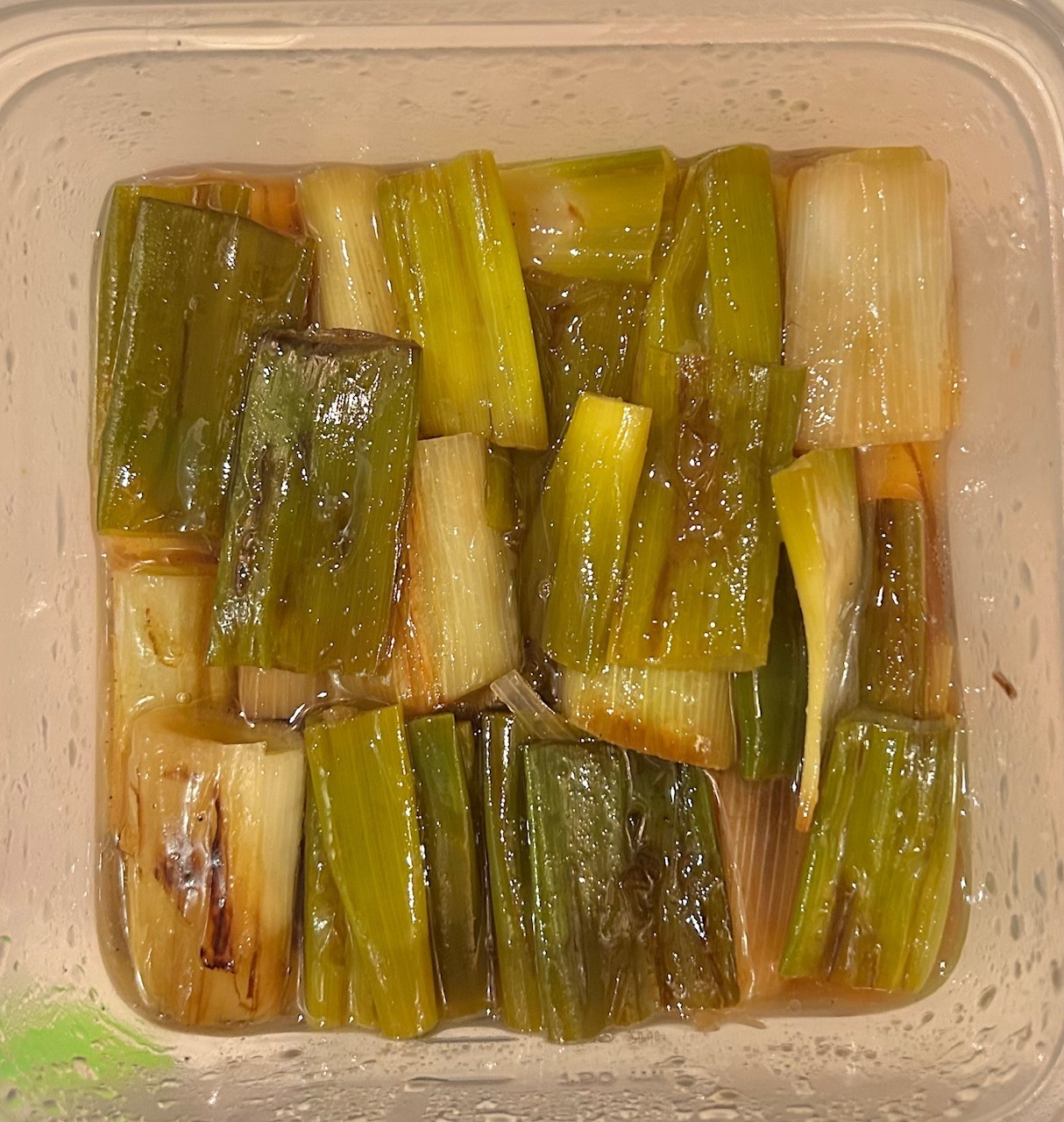 ④焼けたネギをまな板に取り出し適当な大きさに切って、白い所を下、青い所を上になるようにマリネ液に浸けます。