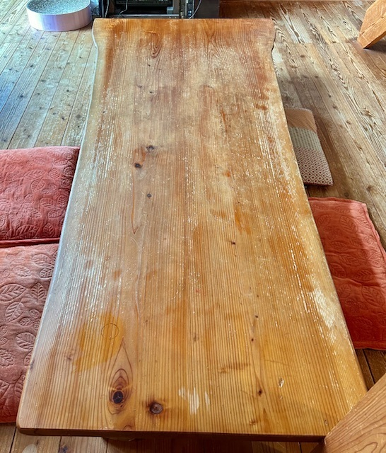 確かにテーブルは少しずつ擦り傷とかついてきます。どうしたら?と思いますが、自分でメンテナンスするのは良いですね。薪ストーブに木目の綺麗なテーブル、本当に雰囲気のある素敵なお家ですね🏠