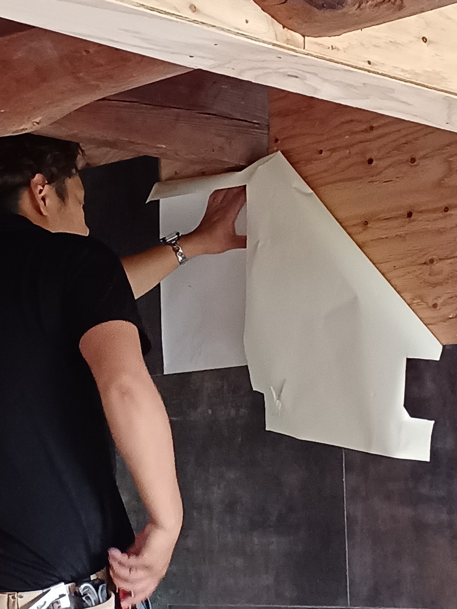 職人さん急に薄い白いのを壁に当てて何かしてます。