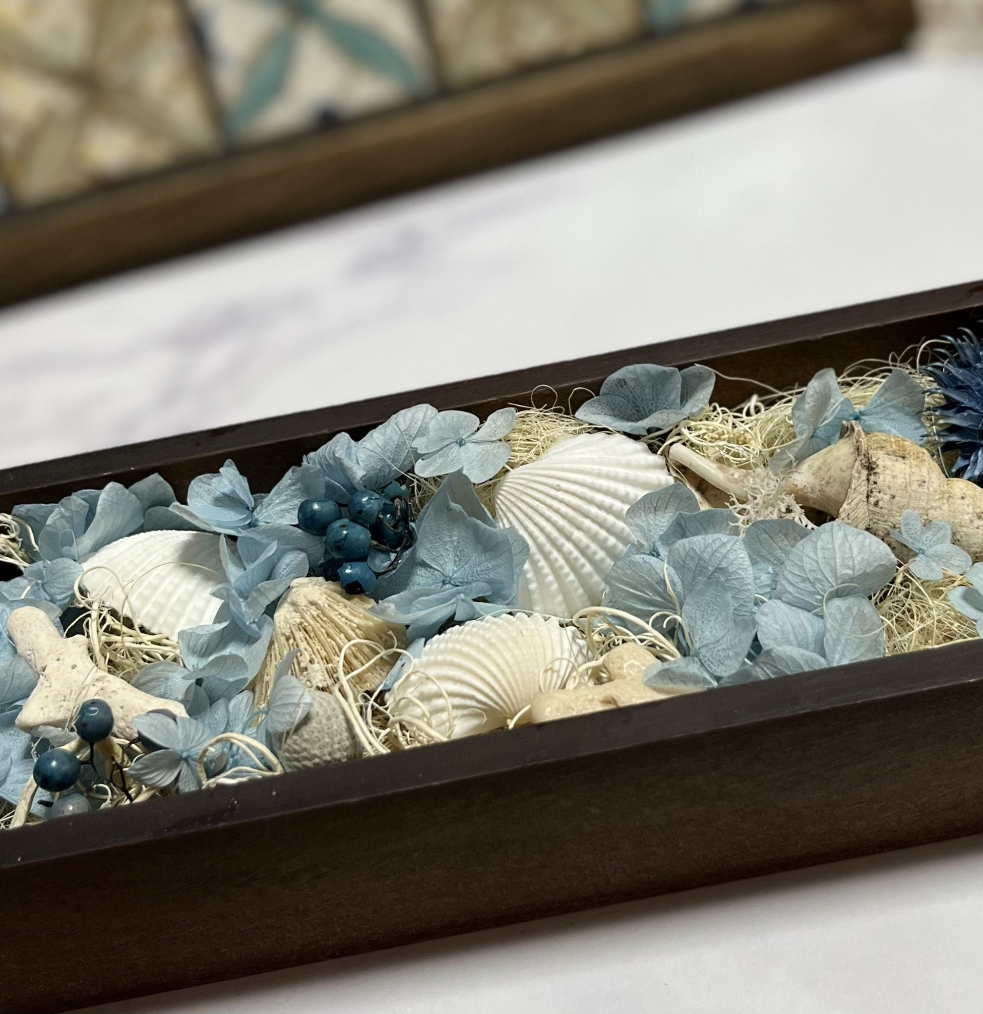 貝殻や珊瑚礁などと一緒に、涼しげな夏色のフラワーをBOXに詰め込んで作品にしてみました。