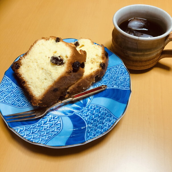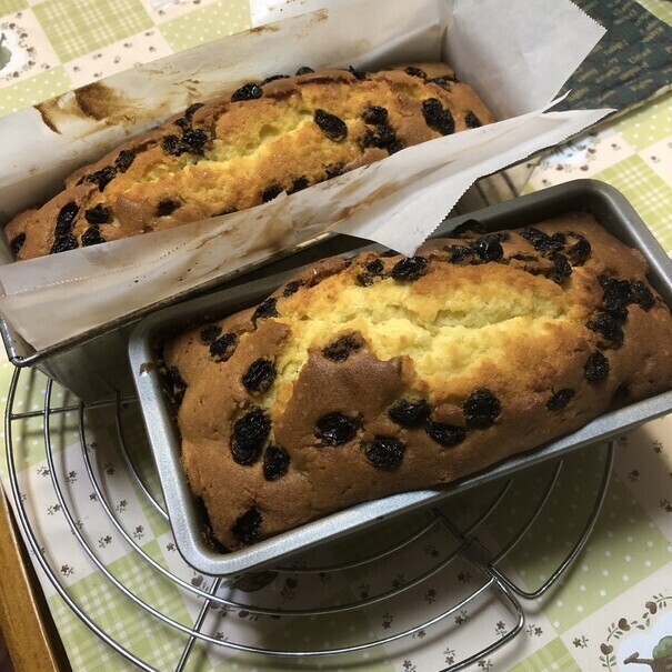 パウンドケーキ、レーズンたっぷりでごちそうなおやつですね✨(〃∇〃人)