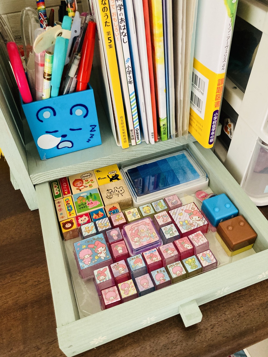 引き出しは浅めなので、何を入れようか相談した結果スタンプを入れることに。ひと目で見やすく取り出しやすいのがいい❣️と気に入ったようで何よりです😊