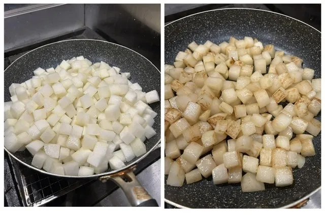 フライパンにバターを溶かし大根を焼き目が付くくらいまで炒めて煮込み鍋に入れる