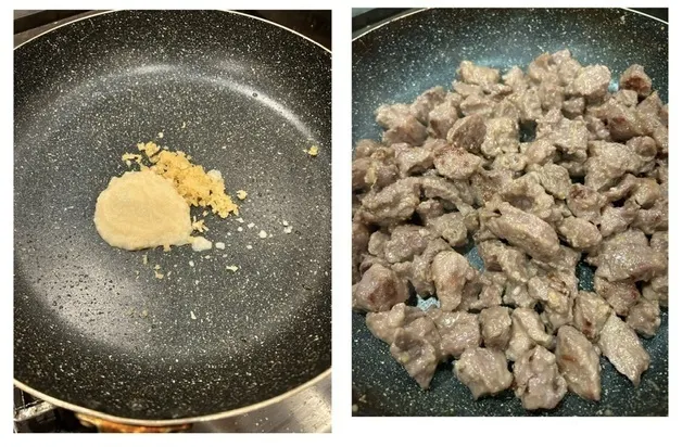 油を足し、しょうがとニンニクを炒めてかしら肉も炒める