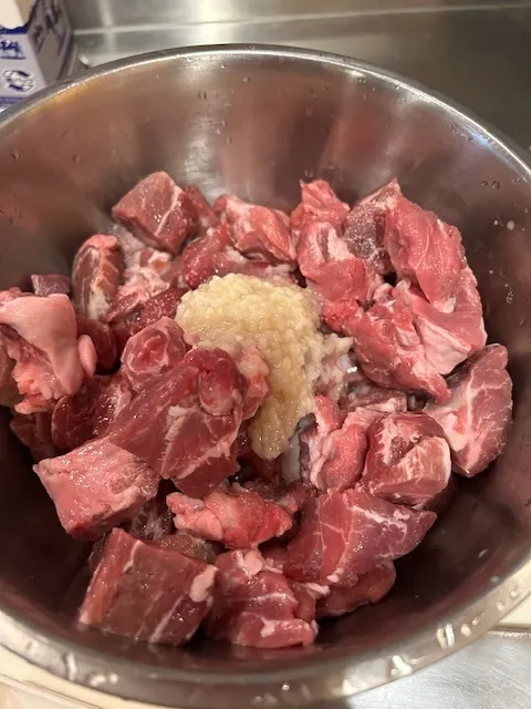 かしら肉をボウルに入れ、塩麹とニンニクを揉みこんでおく