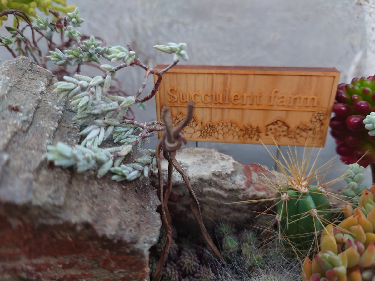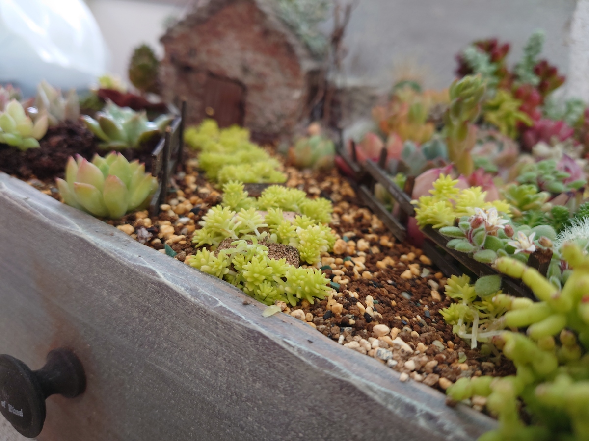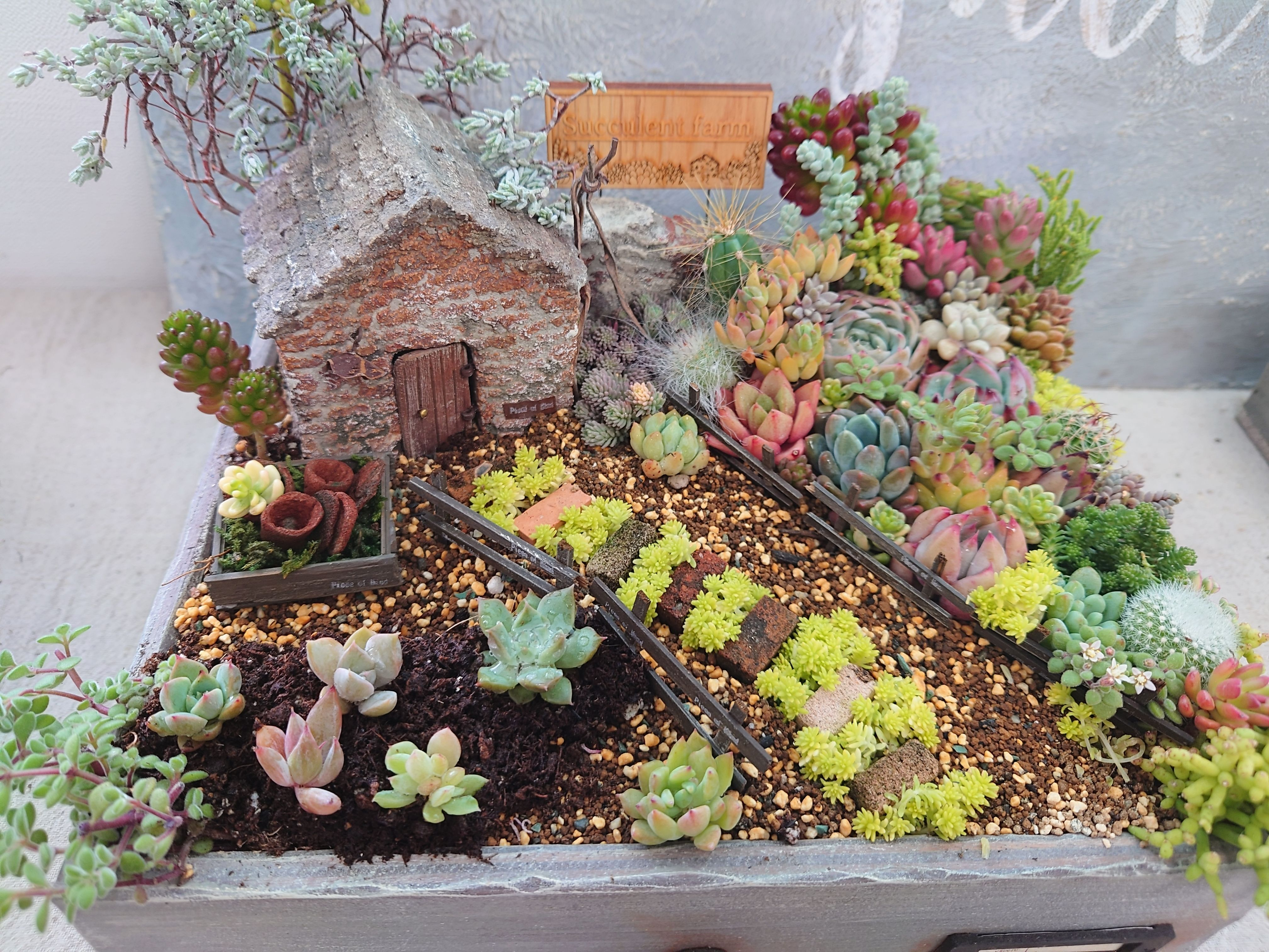 石畳みの道や土を変えて多肉ファームになっているところ、家の隣のセダムが木に見えて、とても素敵な箱庭ですね😍