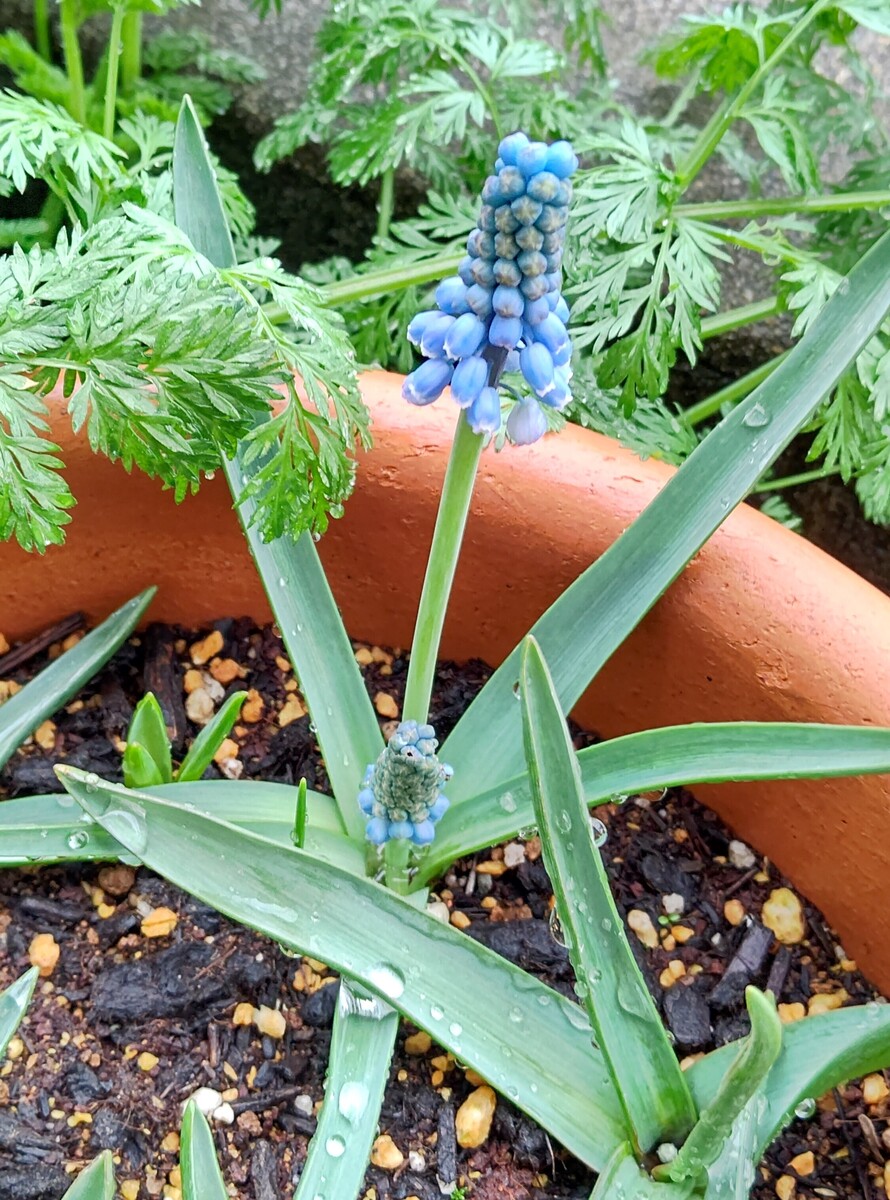 鉢植えのムスカリ。去年買った球根なので葉が太くてしっかり。植えっぱなしでもいつもこんな葉がでてくるといいのにな。