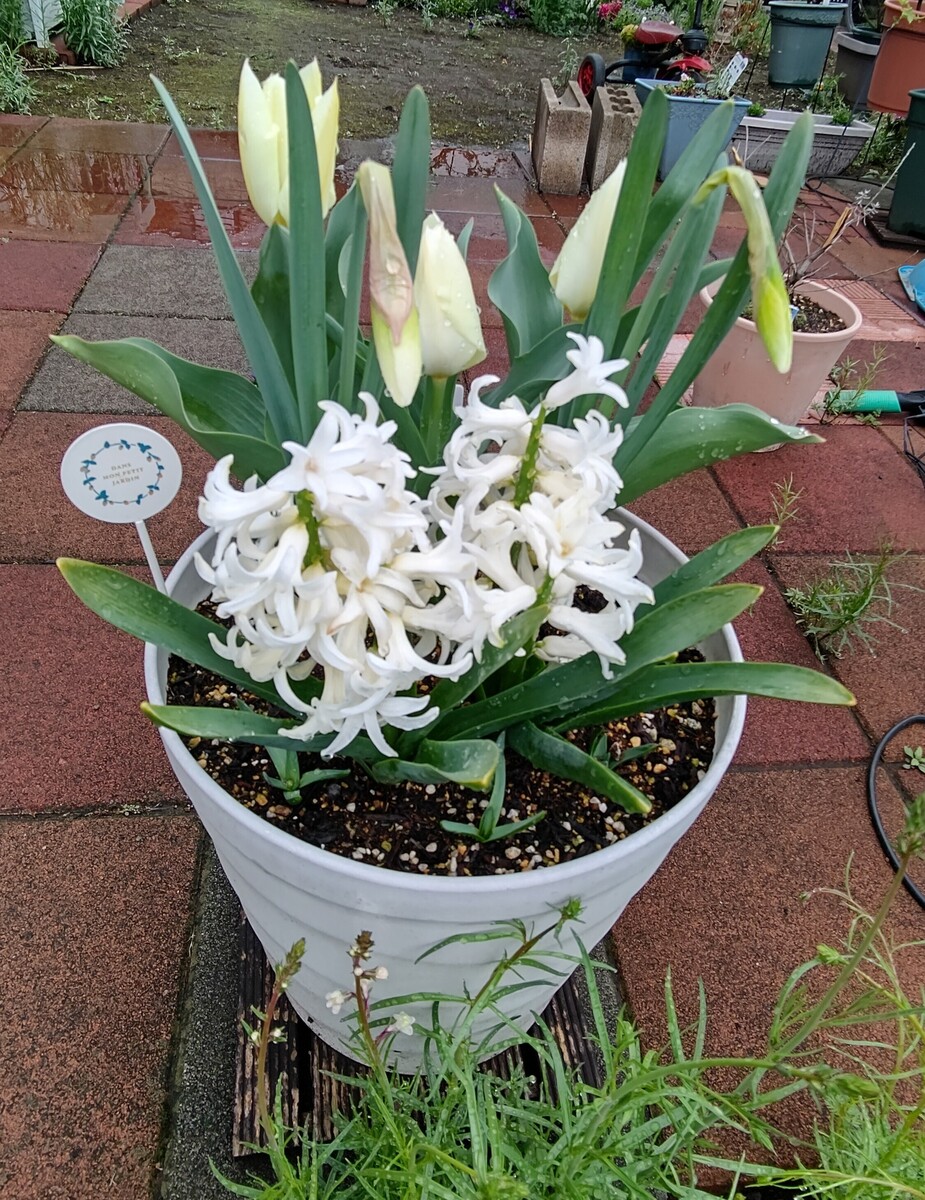 ヒヤシンスがくたびれる前に、水仙とムスカリが咲いてくれるかな?