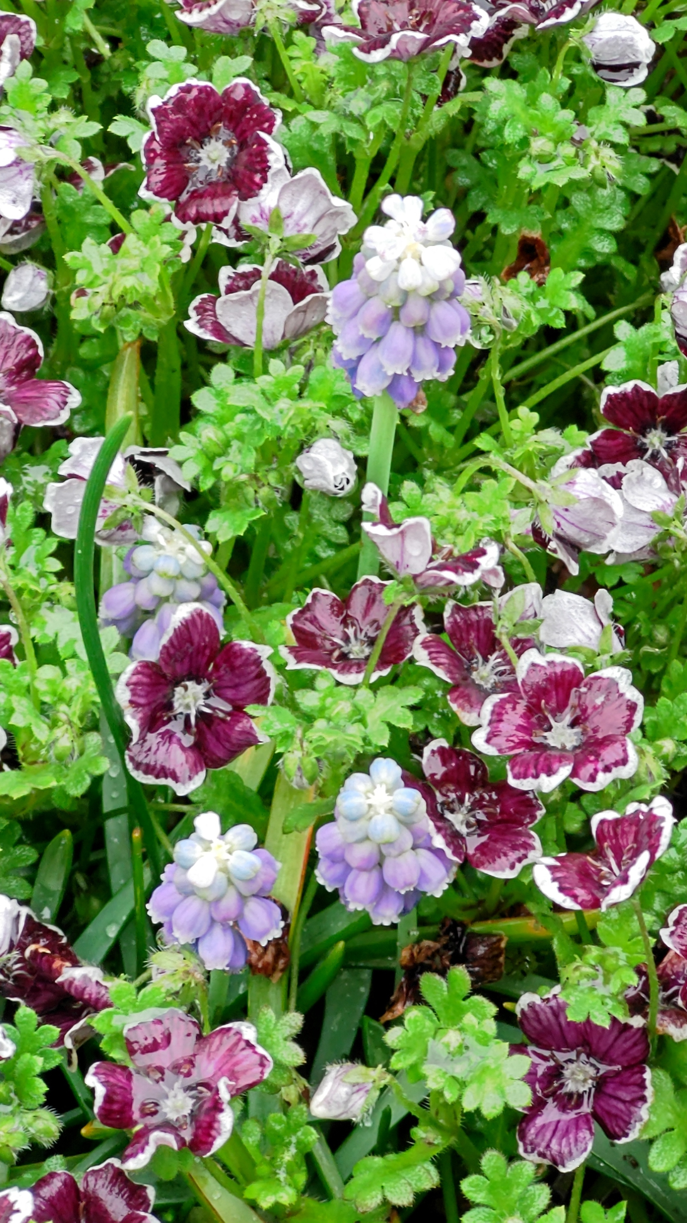 こぼれダネのネモフィラの中に3年目のムスカリが咲いていました