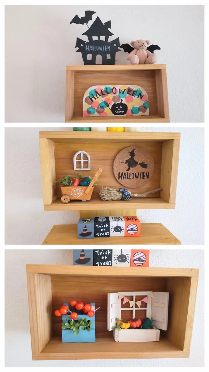 ステンシルシートは自作しました。キューブは6面にイラストを描きました。過去の作品にカボチャやフェイクグリーンを足して、ハロウィンらしくしました。1つ1つは小さいですが、私のアイデアが詰まった作品たちです。
