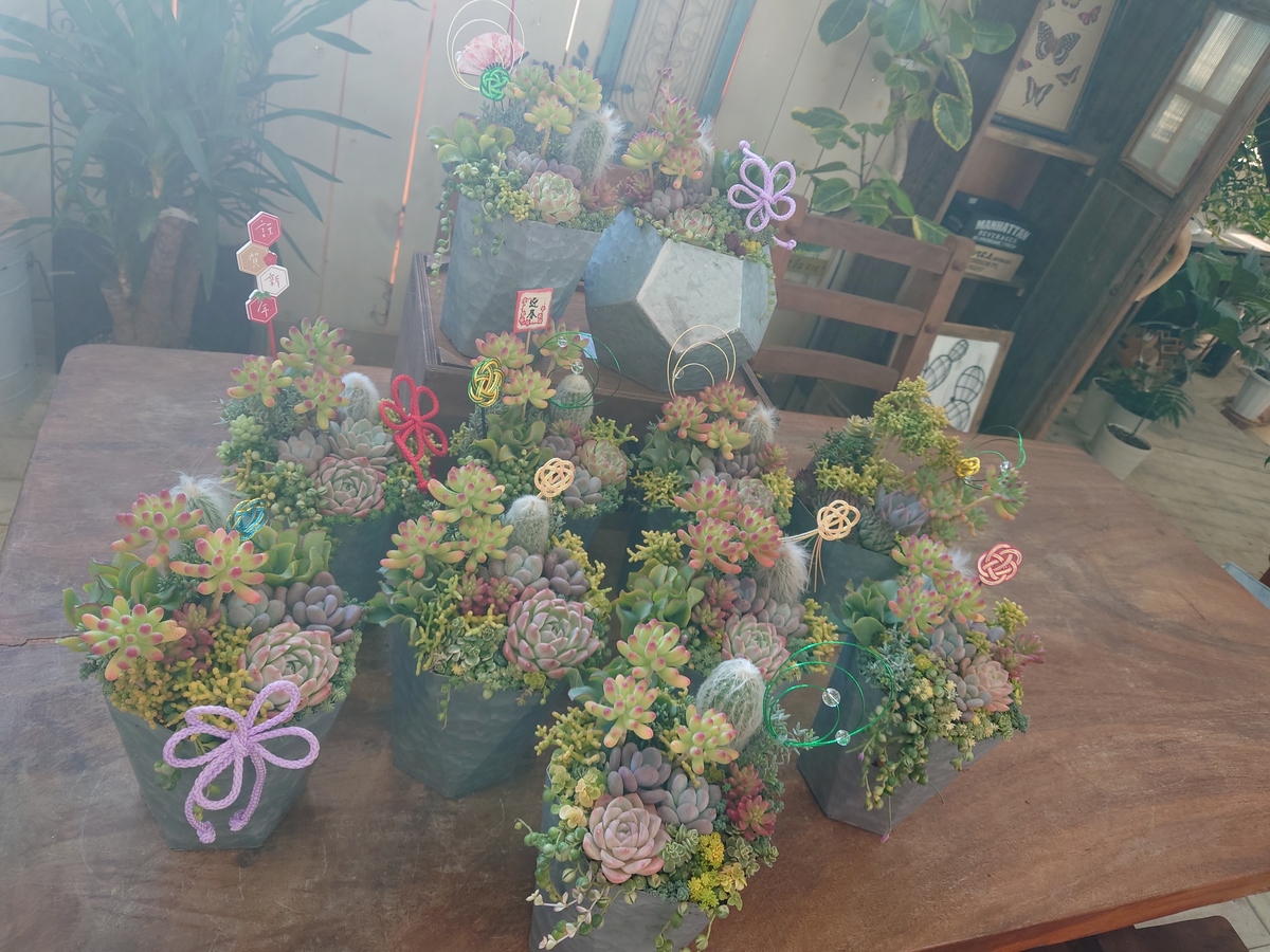 センペルも葉数が多くてロゼットがギュッとしまってキレイな子ですね〜💖水引のピックもステキ✨師匠さんのワークショップいつ見せてもらっても楽しそうだなぁ♥集合写真圧巻ですね❗