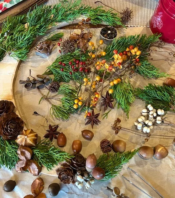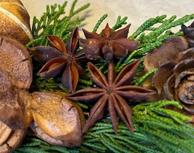 散歩で拾った木の実、許可いただいてむしってきたカイヅカイブキの葉…あ、スターアニスだけはそこら辺で拾えないので100均。