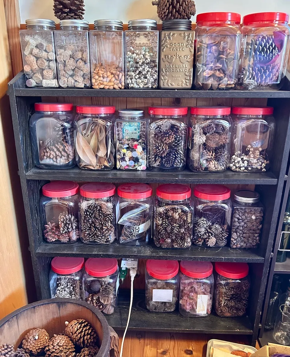 で、左の棚の赤い蓋物は散歩で拾った木の実や葉っぱなど。