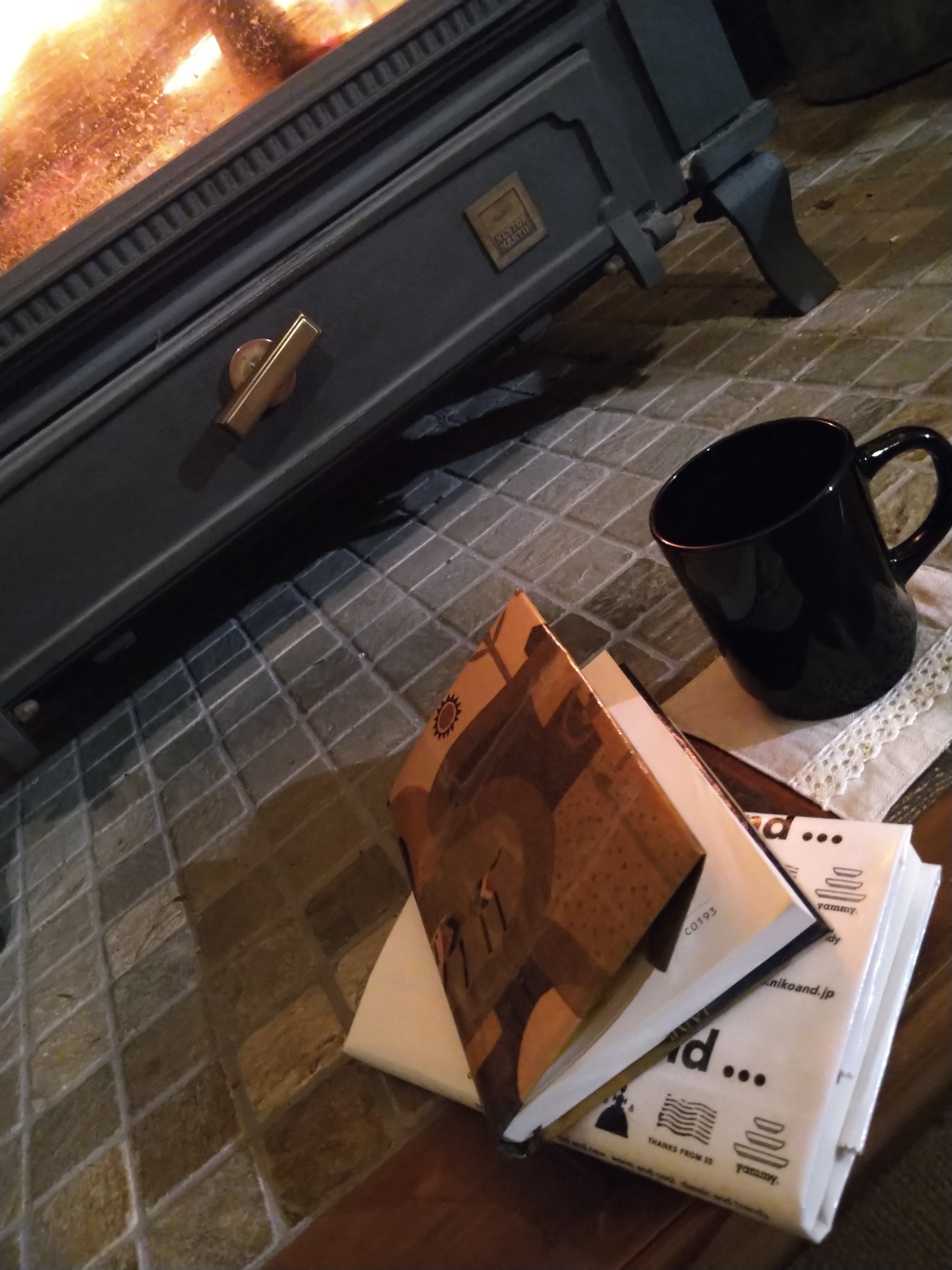 うしろの薪ストーブ におしゃれな床タイル 🤩
