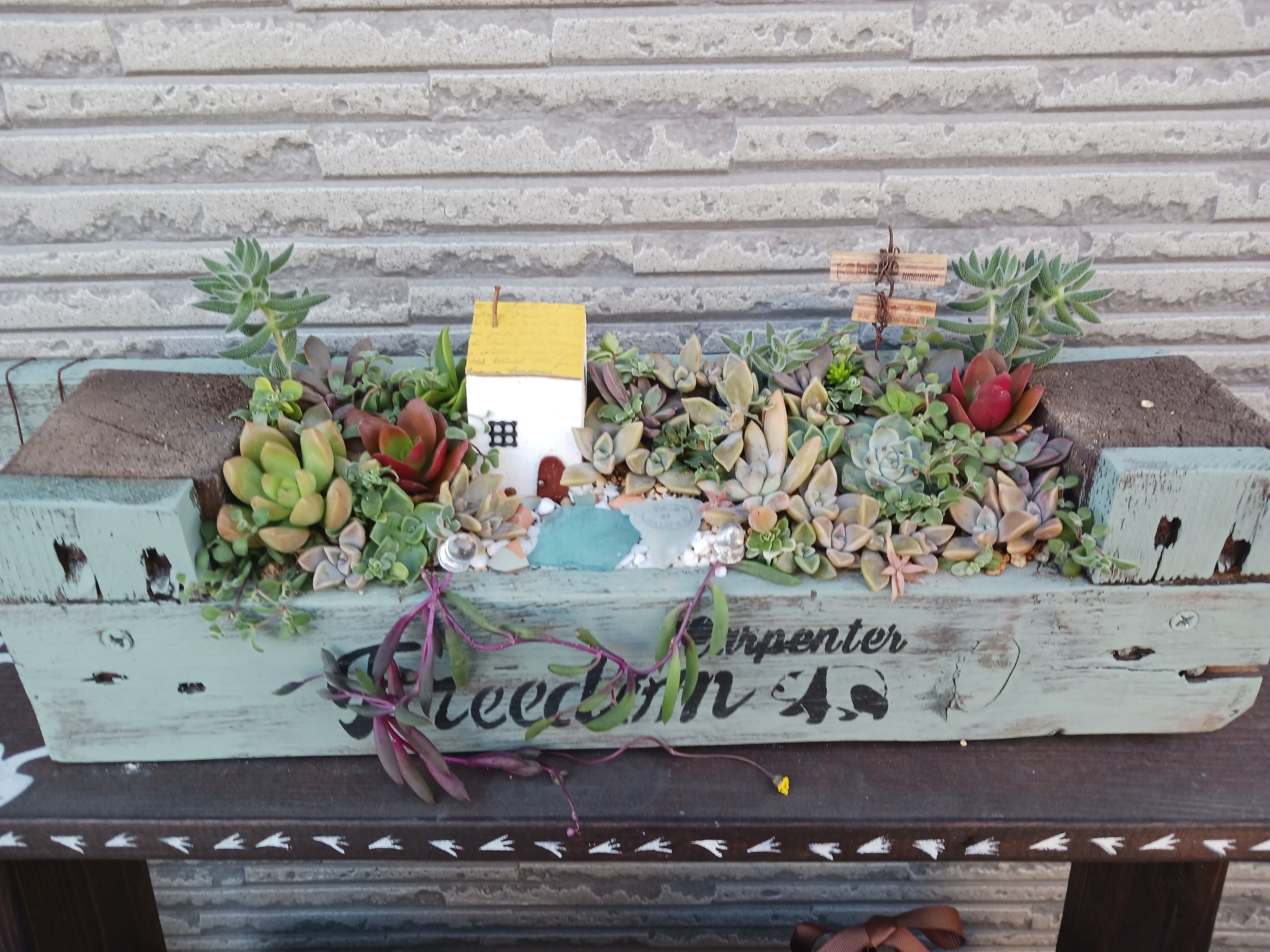投稿を表示パレット材の容器と家の小物でストーリー性のある寄せ植えになってますね😍