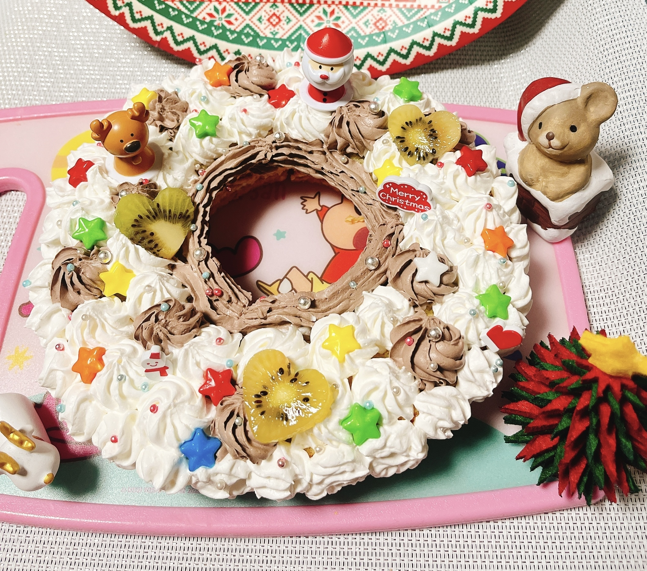 生クリームと飾りで賑やかなとっても楽しい雰囲気のリースケーキです🎶