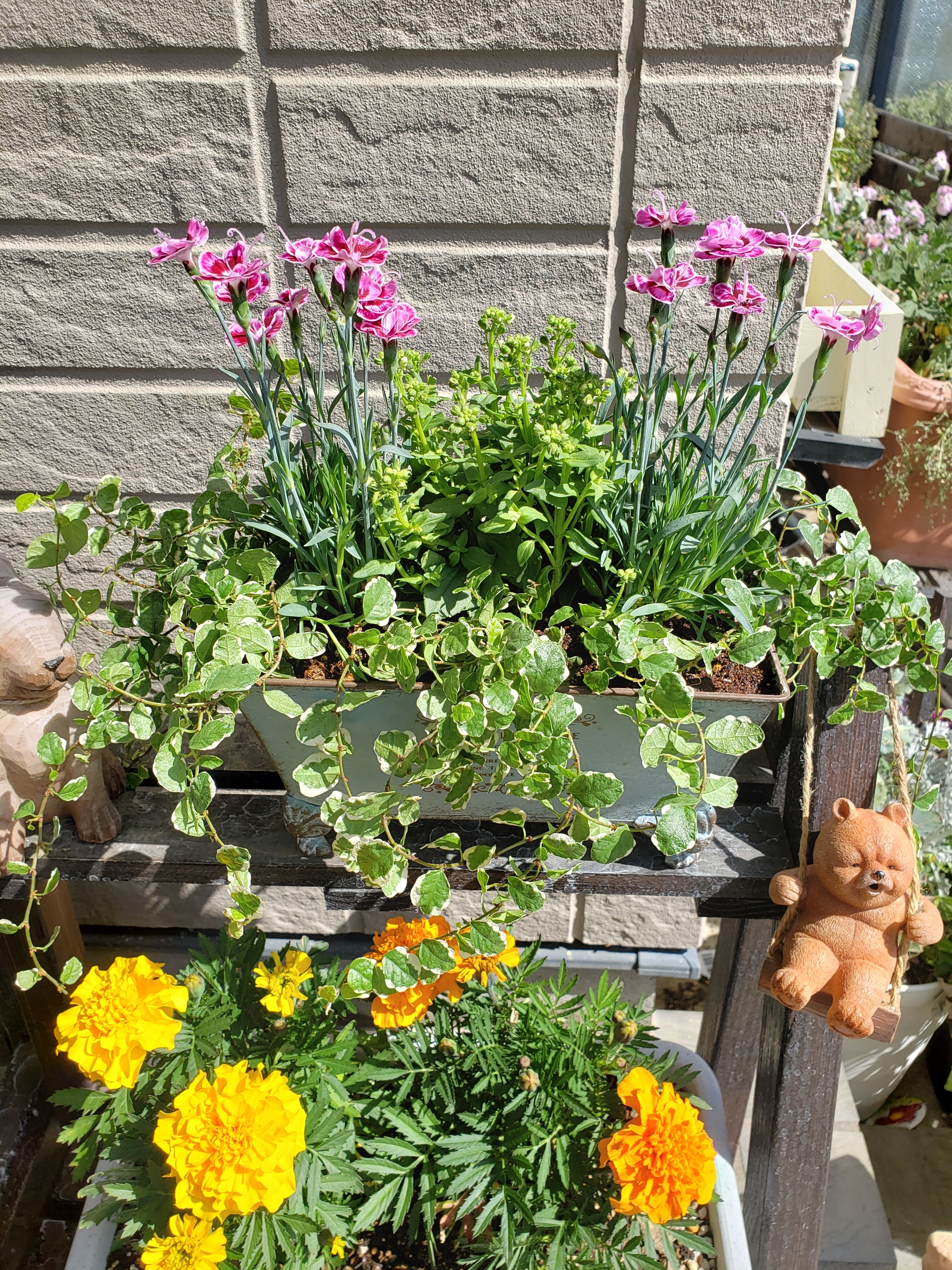 投稿を表示ブランコに乗っている熊五郎🧸眉間にしわ寄せてブランコに乗っている姿が可愛いですね❣️ダイアンサスも次々咲きますね🌸