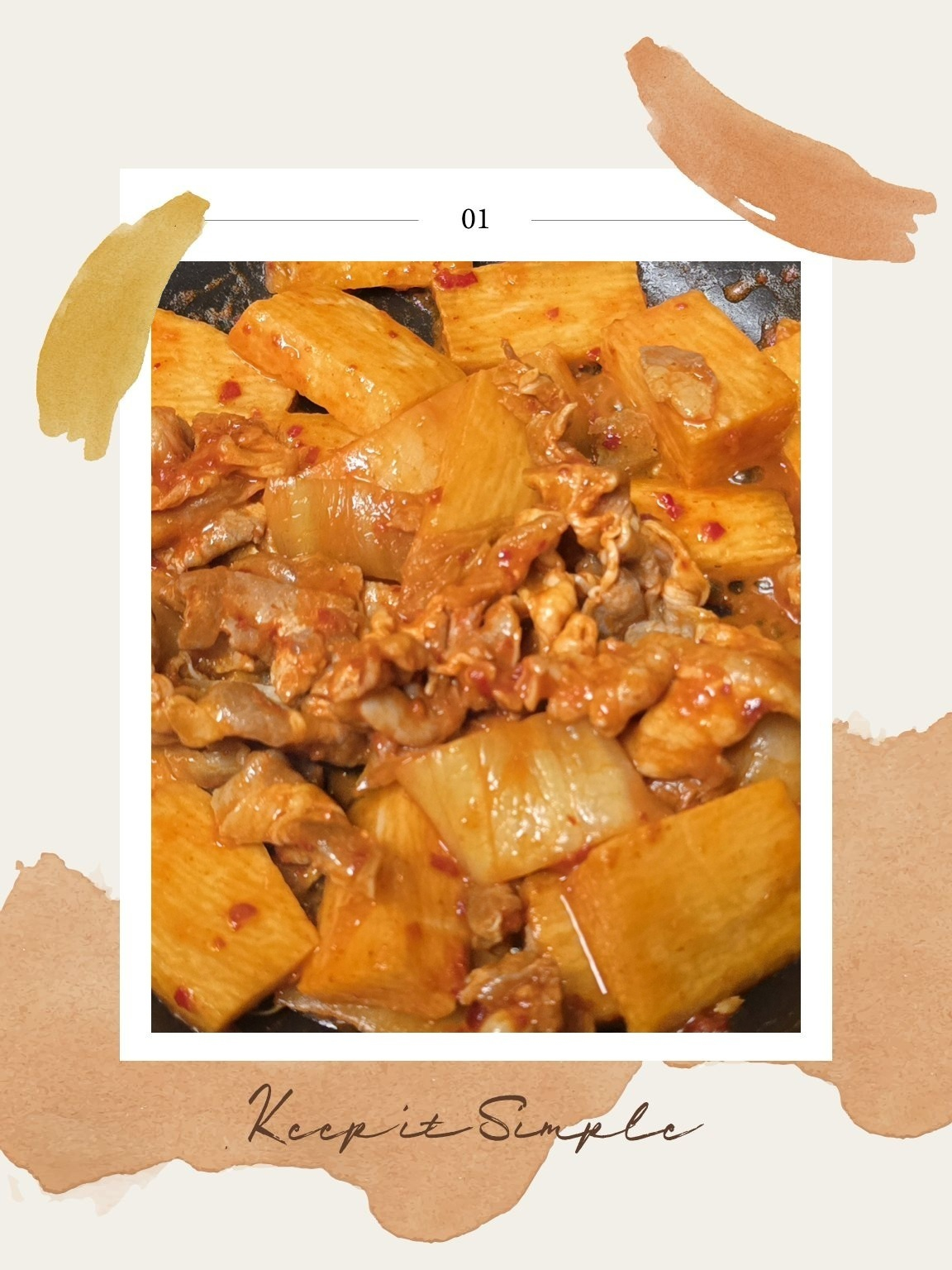 昨日、モールの特設売り場で販売していたキムチの中から2種類買ってみたもののうちの1つ、白菜キムチを使って炒めものを作りました♪