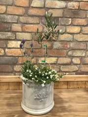 シンボルツリーの寄せ植え 白いズッシリとした鉢にオリーブ、レースラベンダー、バコパの寄せ植えをしました。オリーブは4種類から選べたので育てやすく寒さに強いルッカを選びました。オリーブの花 初めて見ました。可愛いらしいです💕1鉢だけ花が咲いていたのがあったので、もしかしたら早く実がなるかも🤔と思ってこの木にしました。バコパの花