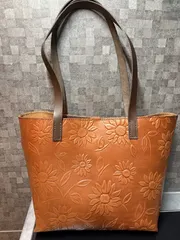 レザークラフト【トートバッグ👜】 今日はレザークラフトのワークショップで【トートバッグ👜】を作りました😊。私にしては初の大物チャレンジ✨用意されていたレザーがたくさんあって迷いに迷って型押しレザーについてしました😊が、元々厚めの革だったのに型押しで更に硬くなっていたので、重ねたところがめちゃくちゃ縫いにくかった💦底には鋲をつけてあり