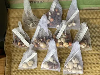 遅ればせながら、球根の掘り上げを。残念ながら腐ってるのもありました。2年経過した品種もあり、この秋には一部増量を考えた方が良いかもです。アイキャッチ画像の球根を入れた白いネットは、球根購入時のネットをとっておいたモノです。先日、100均レモンで仕入れた根菜ポケットに納めて、物置き内に吊りました。↓1