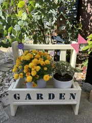 ベンチ型プランターを作ってきました😄細かい製図があり大変でした外に置いてる花が可愛い❤️ベンチ型プランターに置けて良かったです🎶😄