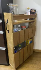 😊ありがとうございます! 上棚の高さは240mmあるので500㎖のペットボトルが立てて収納可能👌 何よりも軽いので一人で楽に移動できます👍 DIYは、楽しいですね😃最高💕