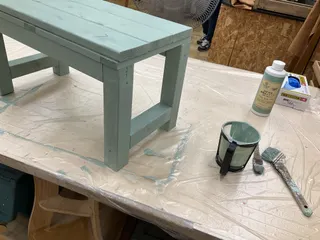 ミニベンチ ロング ミニベンチを作ってきました2名のWSだったのですが、もう1人の方がキャンセルされたそうで、前回に続きボッチWS…淋しい…😔帰宅してから画像撮影と思ったのですが、早速回覧板入れの箱の置き台に採用されて撮影出来ず💦作業中の画像のみとなりました