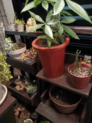 「アレンジアワード2023【ボックス型3段シェルフ】」 旦那さんと参加しました。ボックスだと多肉並べるのに丁度良かったのですがパキラが大きくなりボックス型の前と後をはずし板を足して大きな鉢も乗せれるようにアレンジしました。左がアレンジ前。右がアレンジ後、キャスターも装備しました。💞😄