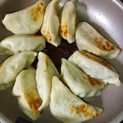 久しぶりの(巨大)ぎょうざ 強力粉100g薄力粉100g熱湯120ccで11個のぎょうざ😆😆ニラもたくさん採れたので😊💗