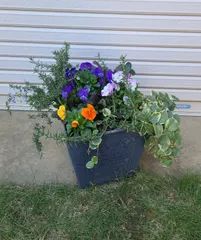 リメイクしました つるにちそうとローズマリーだけになっていた鉢にビオラとアジュガを植えてみました🎵