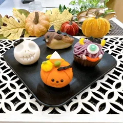 10月の練り切り 10月の 練り切りは『👻ハロウィン🎃』ですダックオランタンアヒルが かぼちゃに突っ込んじゃった‼️かぼちゃの裏は、かぼちゃのオバケ🎃紫いもバター風味モンスターブラン👾紫いもバター風味ガイコツのオバケ☠️こし餡スズメ 〜ハロウィンver.〜ごまこし餡