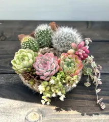 娘が初寄せ植えしました😁 寄せ植えも初めての娘がリース型に編んである物に多肉やサボテンを寄せ植えしました😁凄く配置が難しかったけど、楽しかったみたいです。 娘も多肉の虜になるといいなぁ〜☆
