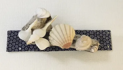 流木と貝殻 ■作品内容海岸で拾った流木と貝殻を使いました■こだわりポイント流木がとてもかっこよかったので拾った貝殻と一緒に飾ってみました。布の中には厚紙を挟んで画鋲で止めてあります。