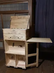 アレンジアワード2023 [ワイン箱 DE システムワゴン] ↑下 二段は、本を収納 最下部には、強度を高める補強板(ワイン箱蓋の端材を縦に、仕切り板風に設置)も取り付け、重い本が入ってもしならないようにしました 最上部はモバイル型パソコン、コンセント、折りたたみ式ボード収納用 上から二段目は一段引き出しがセットされています(前側から後側から両開き可能)↑上部