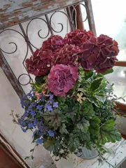 こんばんは〜、ぷりぶりです☺️5月もちょこちょこギャザリングしてましたよ〜。師匠の所でお題はフリーでしたが、5月のおすすめはアジサイ。アジサイも、品種が色々と出回っておりますね。どのコにしようかと行く道すがら考えておりましたが。作業場入った途端、このコに目を奪われました!!ワインレッドのハイドランジ