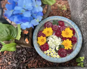 雨の季節に花手水🌼🌿🌼🩷