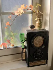 頂き物の木箱に蓋をつけて、レトロ電話っぽくパーツを配置、収納も出来る飾りに! コードは卓上カレンダーのリング、ダイヤルはヨーグルトのプラスチックの蓋で。 受話器を何にするか迷ったけど、ガラスの小瓶が色味を添えてアクセントになったので結果オーライ✨