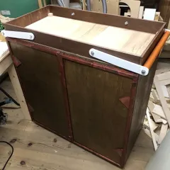 2代目塗装用具入れになります。初代の塗装用具は、1枚板の引き違い戸で開閉できる箱に入れていました。溝をうまく作れず、湿気もあって次第に開けにくくなってきたことや塗料の数が増えてきたことから、作成をはじめました。 ■完成後■上は取り外し可能で、塗料や塗装用具を運べるようにしてあります(後に大