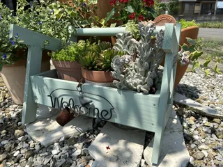 ベンチ型フラワーボックス ワークショップの初作品!草たちに埋もれてますが存在感保ってくれてます。