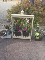 マルシェ 地元のマルシェに行った時のお花屋さんの作品です😁初心者🔰なので、花🌹の種類や寄せ植えを参考にしてます。