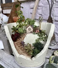 カインズさんで購入した、ジャンク風な鉢に色をつけて、お庭風に植えてみました。