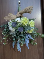 春に作ったミモザのスワッグが残念な色合いになったので日差しの強いこれからの季節用に造花てスワッグを作りました😍少し爽やかになってくれると良いなぁ👍❤️